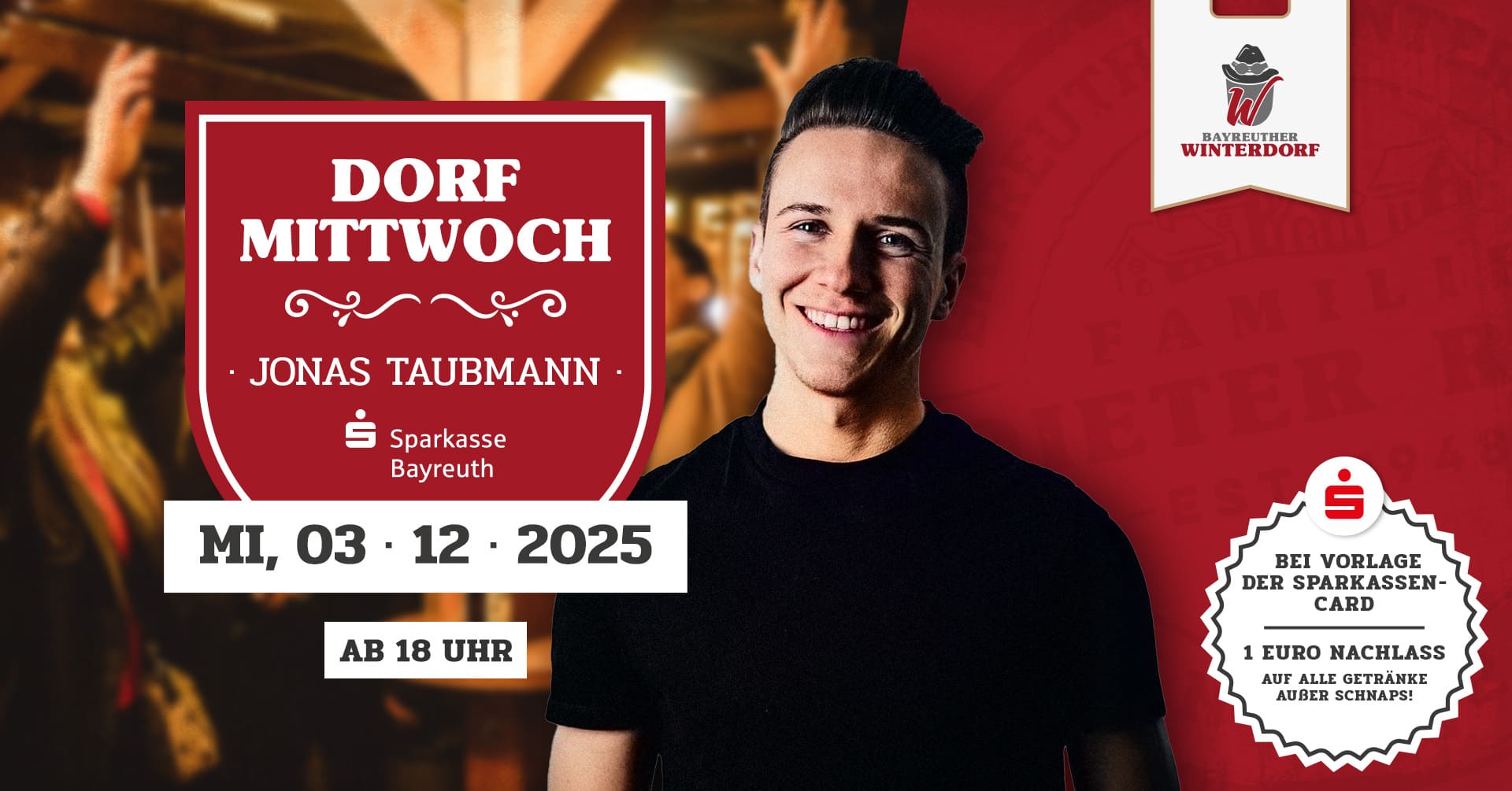 Bayreuther Winterdorf – Jonas Taubmann mit der Sparkasse Bayreuth Ein Abend mit abwechslungsreicher Musik: Jonas Taubmann präsentiert aktuelle Hits und zeitlose Klassiker. Mit der Sparkassen-Card erhalten Sie jeden Mittwoch 1 € Nachlass auf jedes Getränk (außer Schnaps). Bayreuther Winterdorf – Da kommen alle zam! + Zu Google Kalender hinzufügen + iCal / Outlook export Datum 03 Dez. 2025 Vorbei! Uhrzeit 18:00 - 23:00 Veranstaltungsort Winterdorf Bayreuth Winterdorf Bayreuth, Maximilianstraße 12-14, 95444 Bayreuth Teile diese Veranstaltung