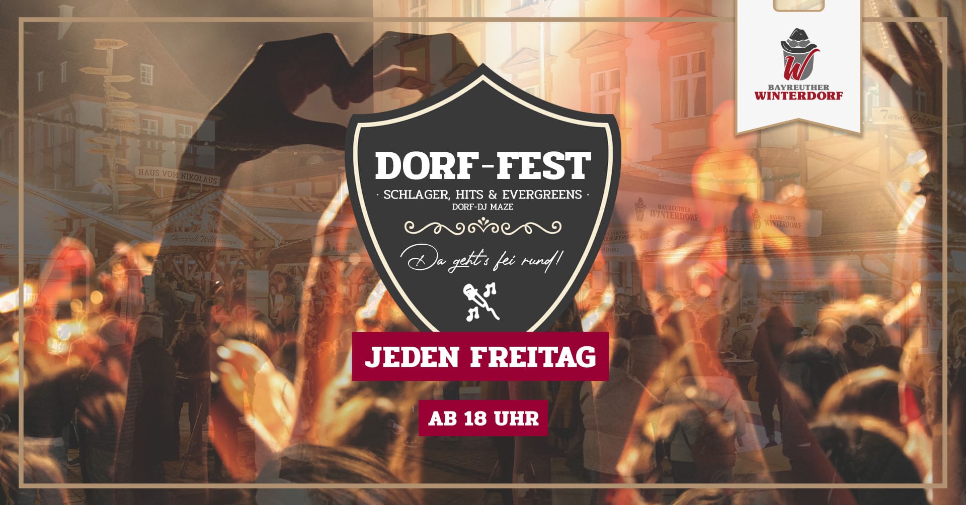 Bis zum 31. Dezember ist das Winterdorf nicht nur Garant für ein gemütliches Beisammensein, sondern lockt auch mit einem täglich wechselnde Programm aus 90’s, After Work, Après-Ski Partys und vielen weiteren Highlights jedes Jahr eine Vielzahl von Besuchern nach Bayreuth und füllt die Innenstadt mit neuem Leben. Egal ob Jung oder Alt, Groß oder Klein bei uns im Winterdorf ist von der Autogrammstunde regionaler Sportclubs über einen Kindernachmittag bis hin zur Live-Musik garantiert für jeden etwas dabei.